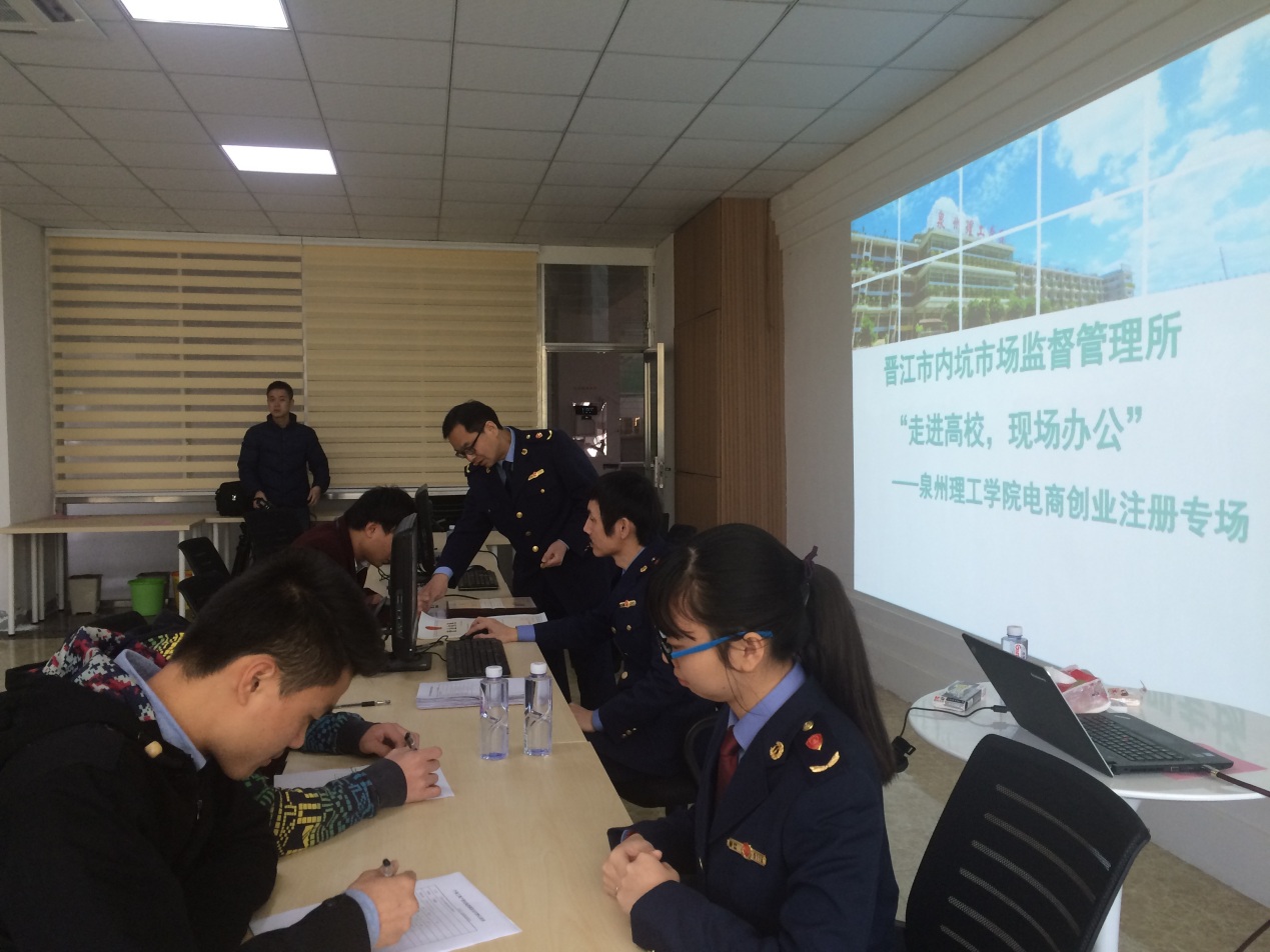 同学们在填写资料 晋江市内坑市场监督管理所工作人员向我校学生颁发营业执照 合影 1 月12日,我校创业孵化基地发挥平台服务优势,与晋江市内坑市场监督管理所进一步合作,开通绿色通...
