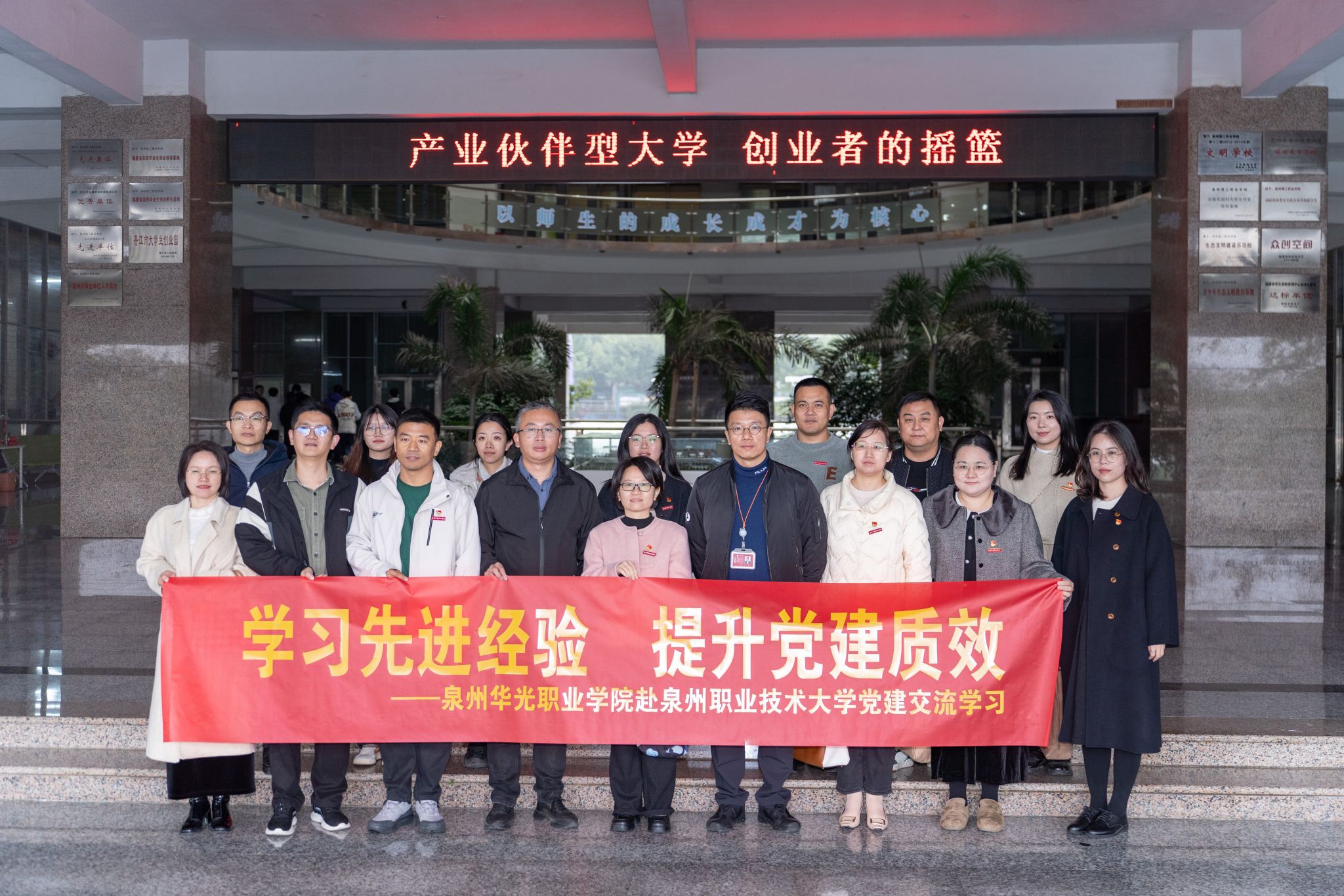 12月25日上午,泉州华光职业学院党委书记王巧萍带领党务干部一行16人来我校开展参观交流。我校党委书记傅志雄、党委组织部/党委统战部部长黄镇红、党委宣传部/品牌传播部部长杨颖聪陪同参观并参加座谈,各基层党组织书记共同参会。王巧萍一行实地参观了我校生态校园沙盘、党建馆、书院党团活动室等场所。参观过程中,傅志雄围绕学校发展历程、办学特色与党建工作成效作了详细介绍。座谈会上,傅志雄代表学校对王巧萍一行表示热...