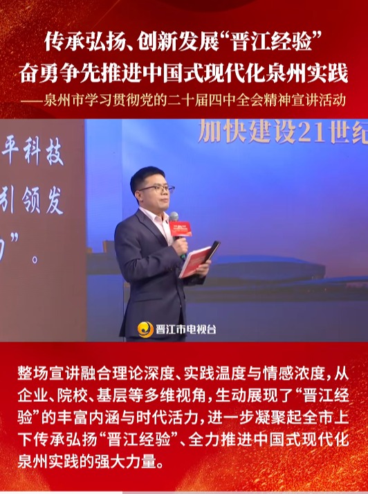 为深入学习贯彻党的二十届四中全会、省委十一届九次全会及泉州市委十三届十次全会精神,持续深化拓展“深学争优、敢为争先、实干争效”行动,12月24日,“传承弘扬、创新发展‘晋江经验’奋勇争先推进中国式现代化泉州实践——泉州市学习贯彻党的二十届四中全会精神宣讲活动”在晋江融媒体中心开讲。 活动中,我校马克思主义学院思政教师周文龙以《数智赋能 产教共舞——泉职人在“晋江经验”引领中的“双向奔赴”》为题作宣讲...