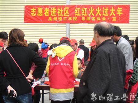 新年伊始,泉州理工学院志愿者进社区写春联送新年祝福,赢得居民一片赞许。 “和顺一门有百福,平安二字值千金”,“横批,万象更新”…… 2012年1月3日上午,在泉秀街道工作人员的配合下,我校青年志愿者...
