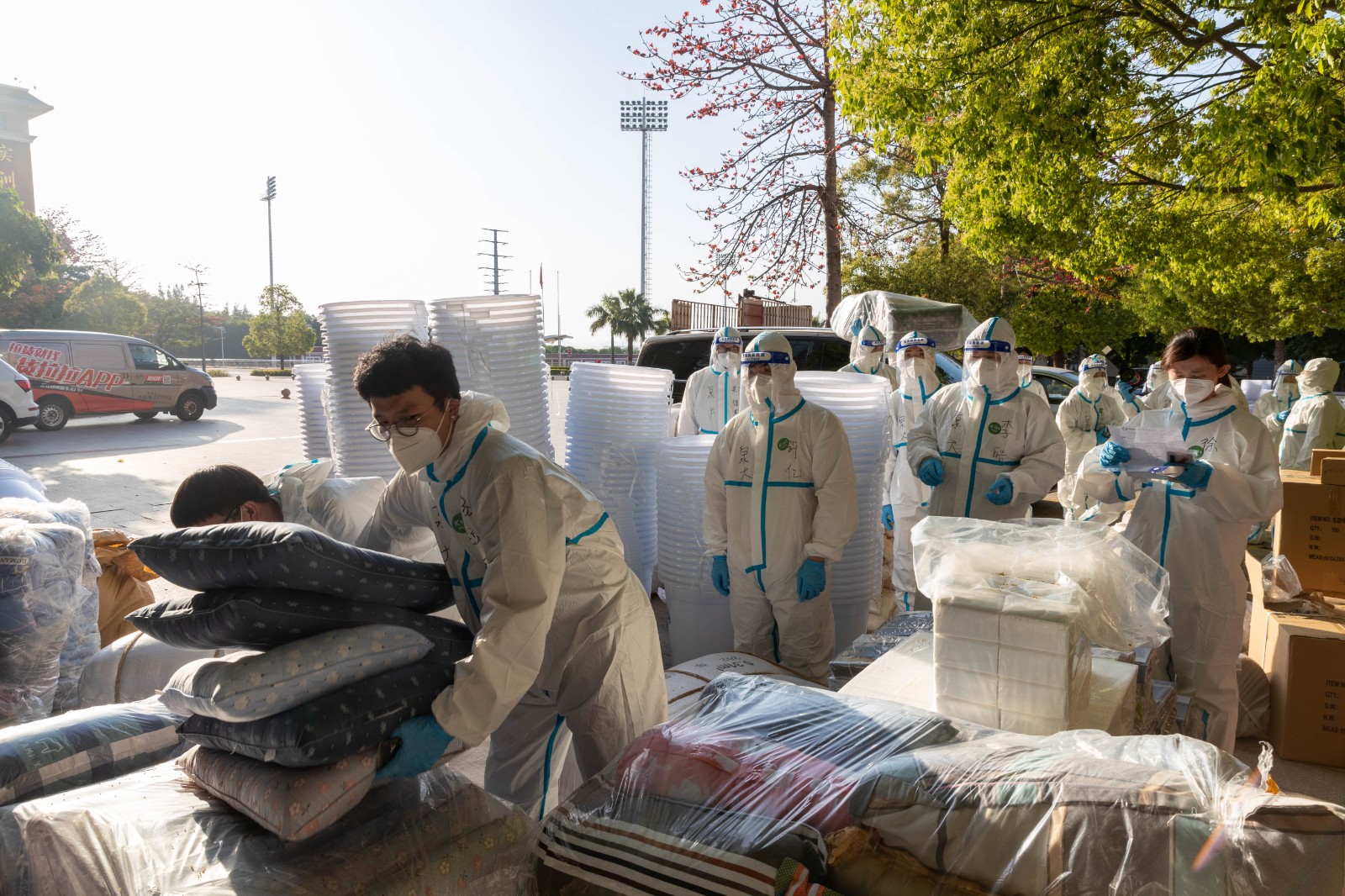 穿上全套防护装备,在背后写上校名和名字,下午3:00,20名教职工整装待发。出发前,校长吴滨如作了动员讲话,并嘱咐各位老师要做好个人防护,一定平安归来!
