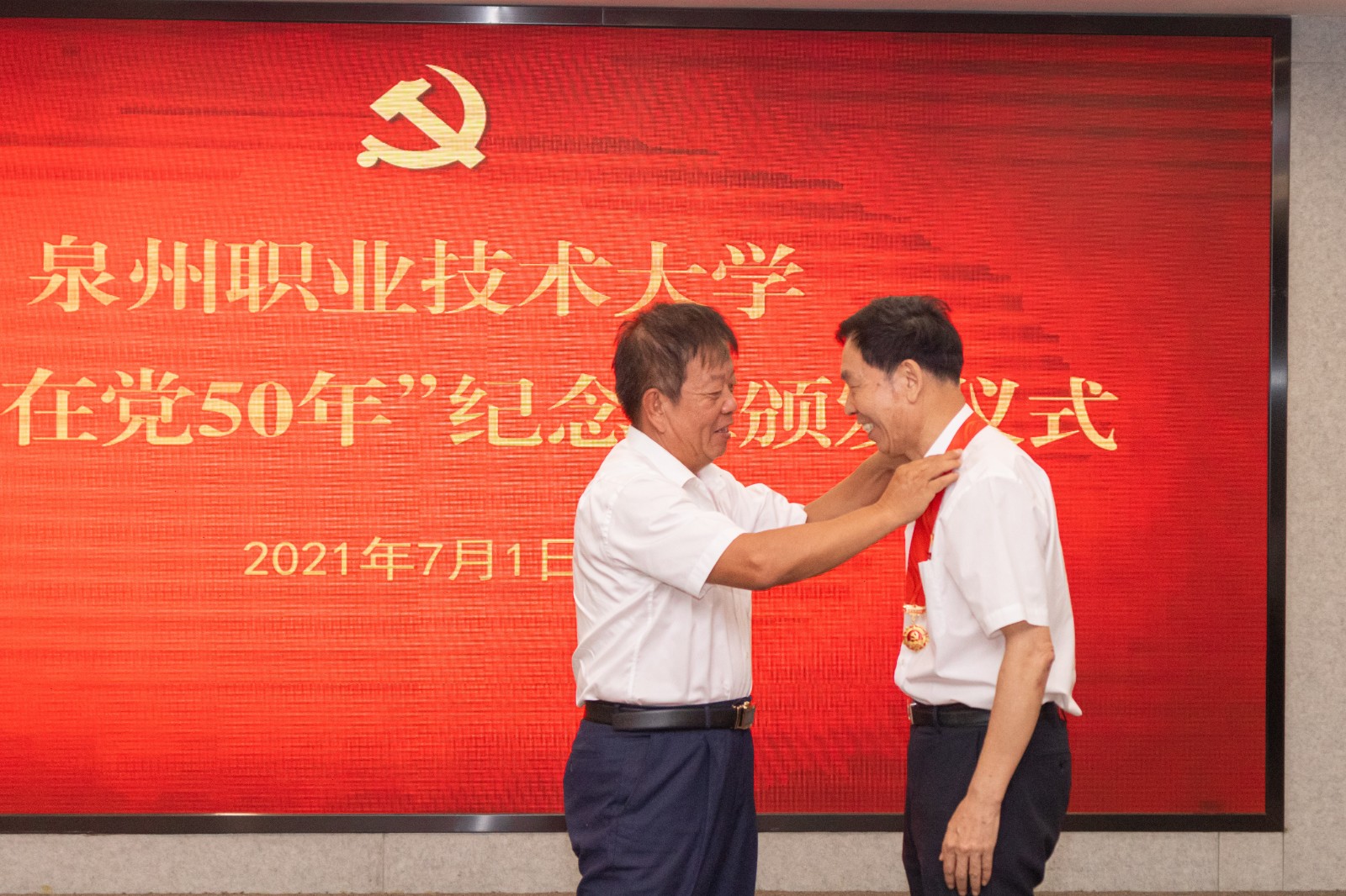 7月1日上午,我校隆重举行“光荣在党50年”纪念章颁发仪式,及时将党中央的关怀和温暖传递给老党员,让他们在建党百年之际真切感受崇高的政治荣光。仪式由校党委书记傅志雄主持,获颁纪念章的老党员、学校中层以上党员干部、党员师生代表参加颁发仪式。