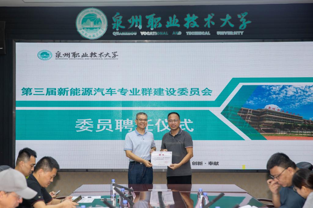随后进行本次会议的第一项议程,为新聘任的新能源汽车专业群建设委员会主任、副主任以及委员颁发聘任书。