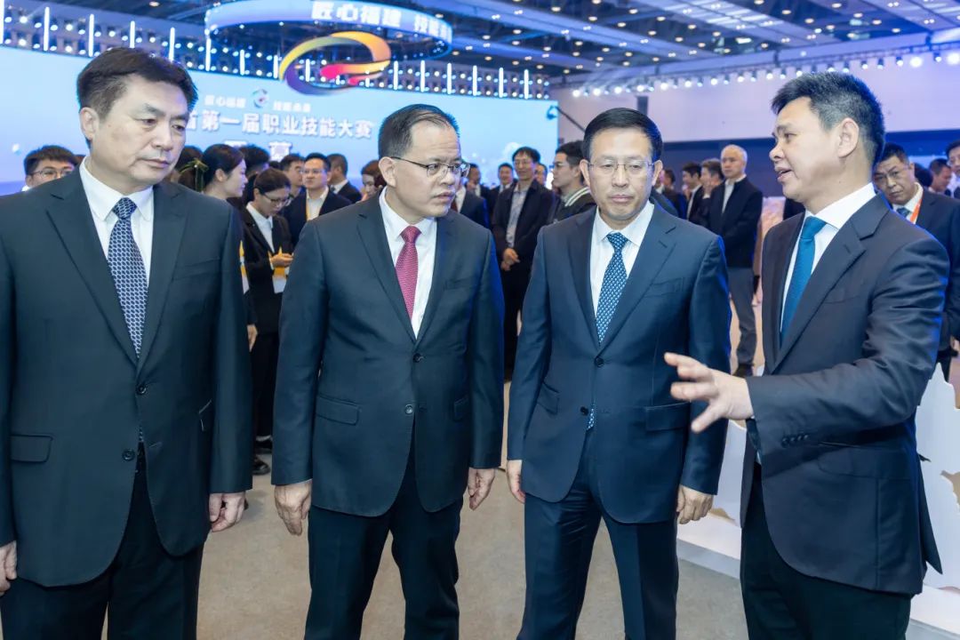 ▲ 人社部党组成员、副部长吴秀章,福建省政府党组成员、副省长林瑞良,福建省人社厅党组书记、厅长孔繁军,泉州市委副书记、市长蔡战胜,泉州市委常委、晋江市委书记张文贤,晋江市委副书记、市长王明元等莅临我校展区参观指导