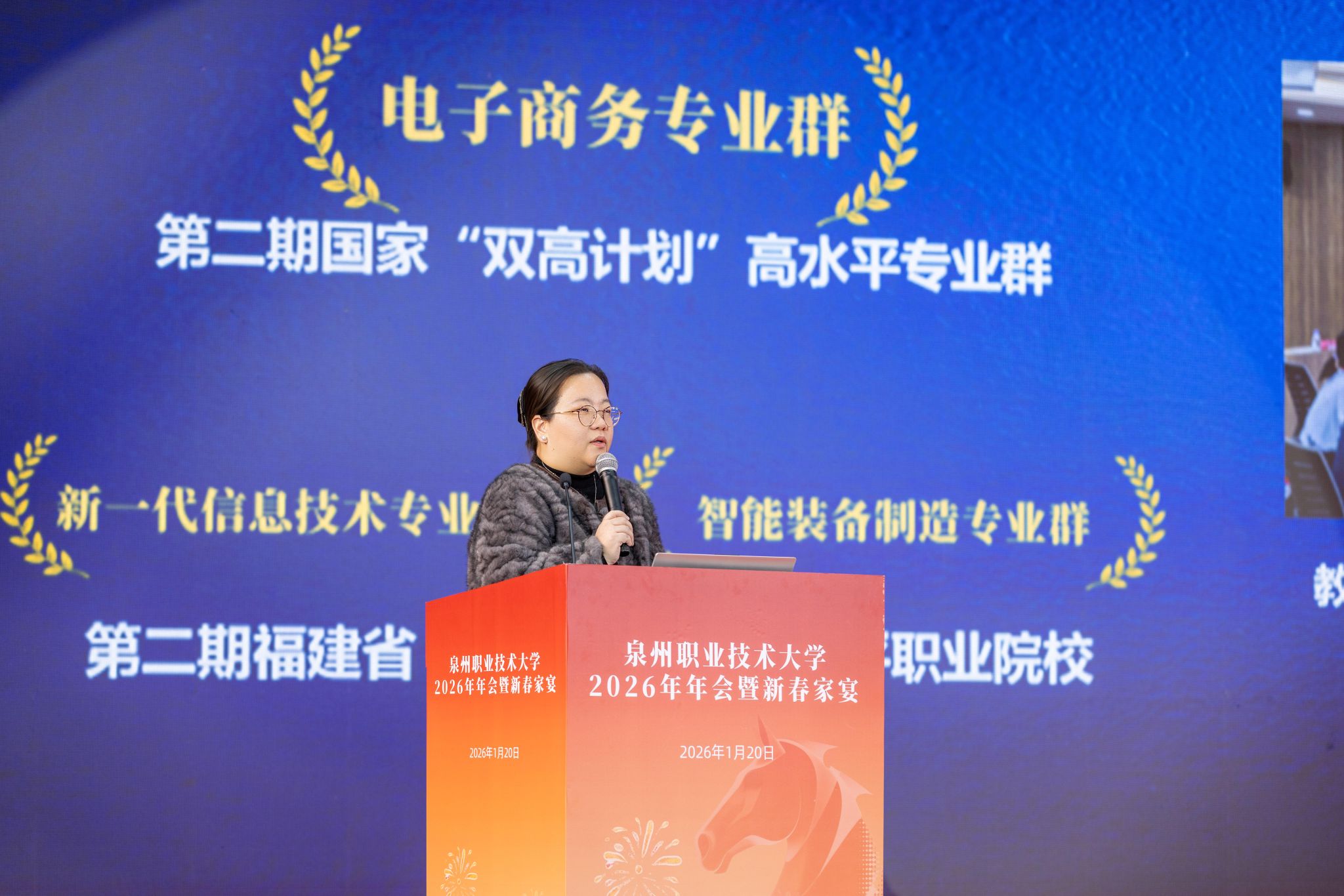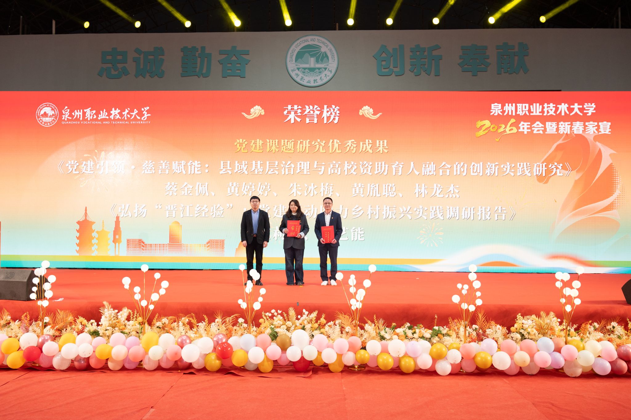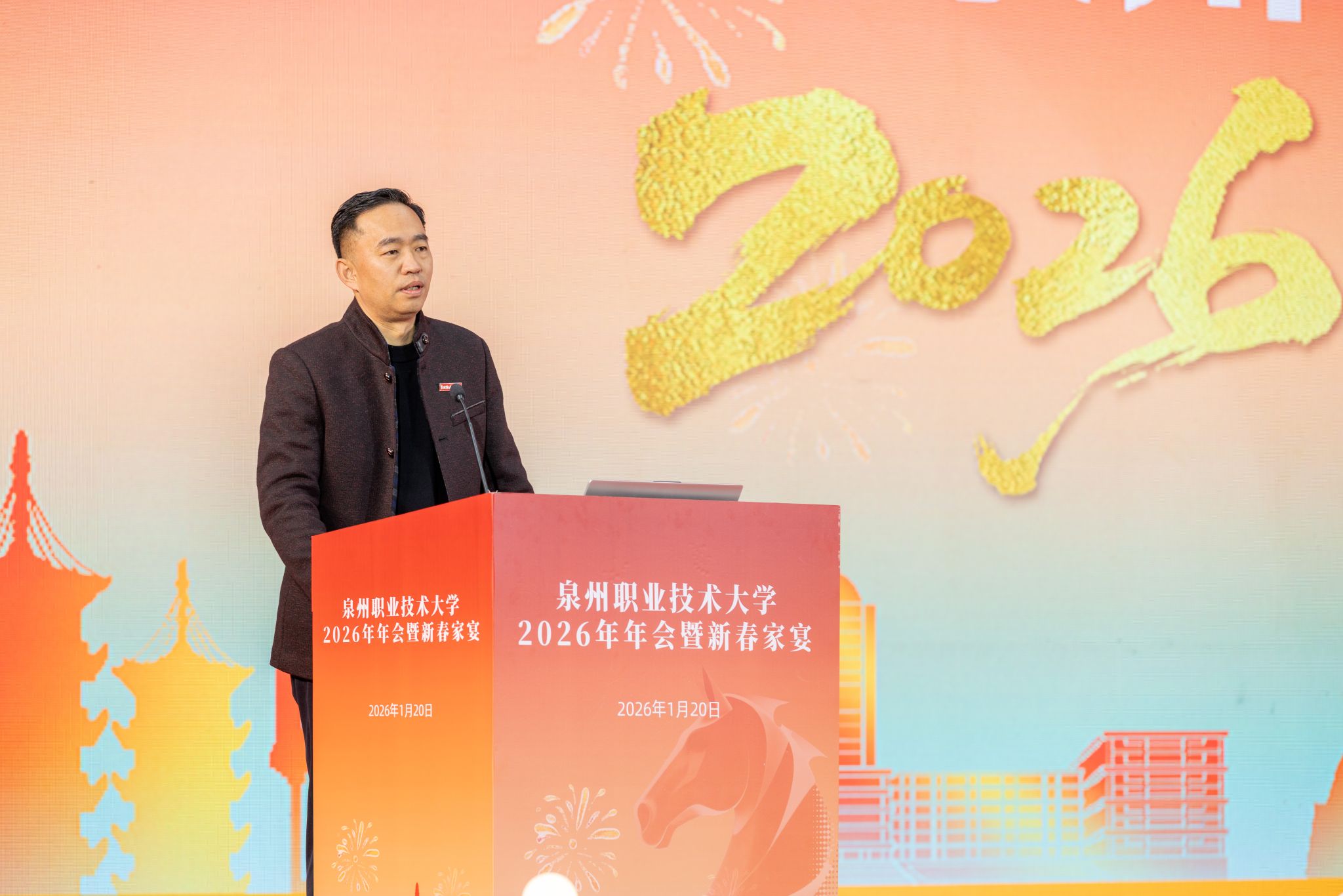 1月20日,泉州职业技术大学隆重举行2026年会。学校创办人、董事长吴金营,泉大教育基金会理事长杨培琛,校长吴滨如,党委书记傅志雄,全体校领导、教职工及产业伙伴代表、南非培训学员参加。年会由傅志雄书记主持。