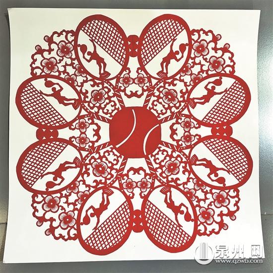 反映运动和时尚的作品也不少。一幅反映世界杯的作品,中间是一座大力神杯,四周散布着足球、球鞋、球衣、球员等足球元素;让记者眼前一亮的是,作品中还镶进一个大大的“福”字,用中国的方式,表达对球员的祝福。一组反映泉州理工学院运动会的作品,包括网球、田径等题材,传统剪纸和现代运动激烈碰撞。