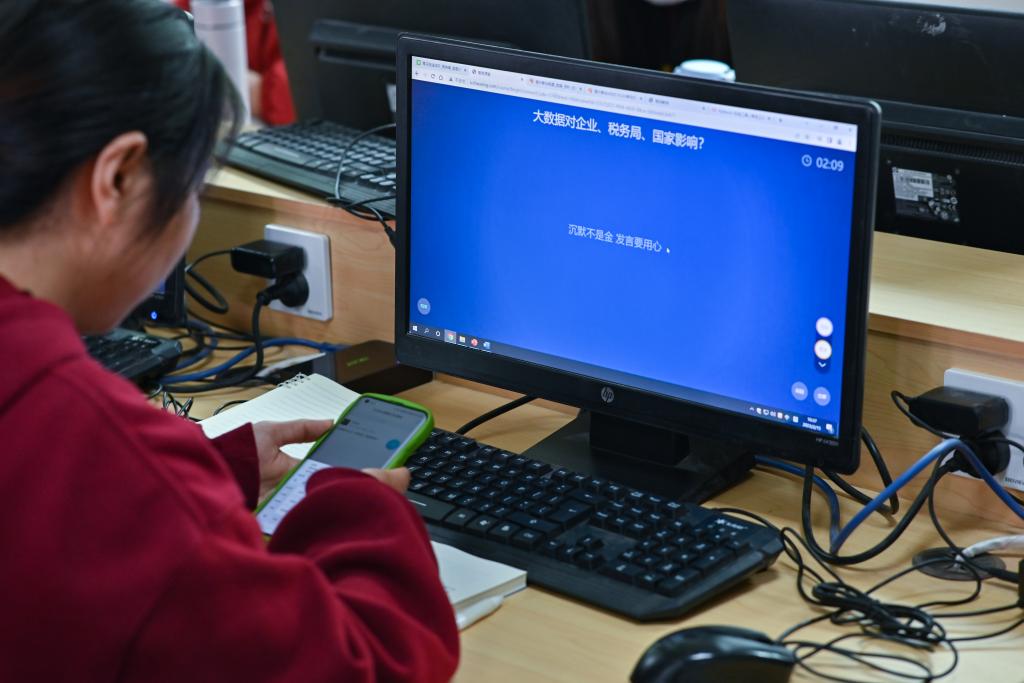 ▲ 郑伟清在课堂对学生进行提问,让大家用手机在群里尽情发言交流