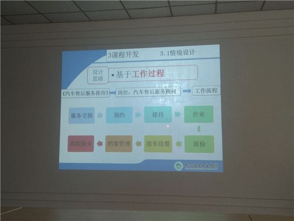 转训分享会首先由郑丽萍老师主讲,讲授的是《汽车售后服务接待》这门课程改革过程。通过PPT展示内容分析、岗位分析、角色扮演、资源库的应用、课程建设等方面。可以看出从传统模式课程到通过改革后的基于工作化系统课程的变化,郑老师也提出了在课程改革的过程当中遇到的一些问题,也提供了一些建议。