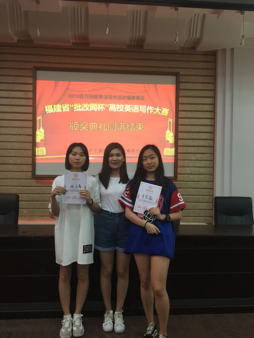 6月22-23日,2018百万同题英语写作活动福建赛区暨福建省“批改网杯”高校英语写作大赛在福建师范大学福清校区举行。商学院吕芷薇、林正青分别获得高职组特等奖和三等奖,指导老师刘芳,领队张明娟。同时,刘芳获“优秀指导教师”荣誉称号。