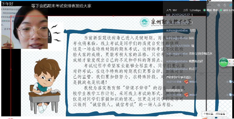 6月2日下午,由财经学院学业辅导员徐燕琴老师组织,在线上举行“期末线上诚信考试及注意事项”会议,主要讲期末线上诚信考试和考试时间安排,与许久不见的同学们聊聊天,疏导同学们期末考试焦虑,合理复习。了解他们的近况,并针对考试期间考试所用软件会发生的突发情况我们做出解决方案。