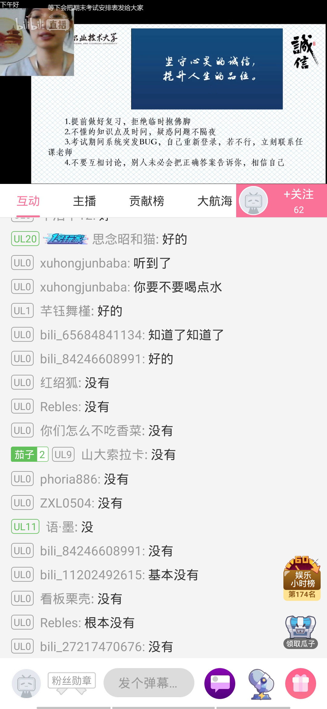 其次预祝同学们期末考试可以取得好的成绩,不辜负这段时间的努力,并时刻谨记诚信考试,不要因为没有老师的监督就失信于人,应该严格要求自己,不作弊,不讨论,才能发挥自己的真实水平,展现自己良好品质,不负大好青春韶华。